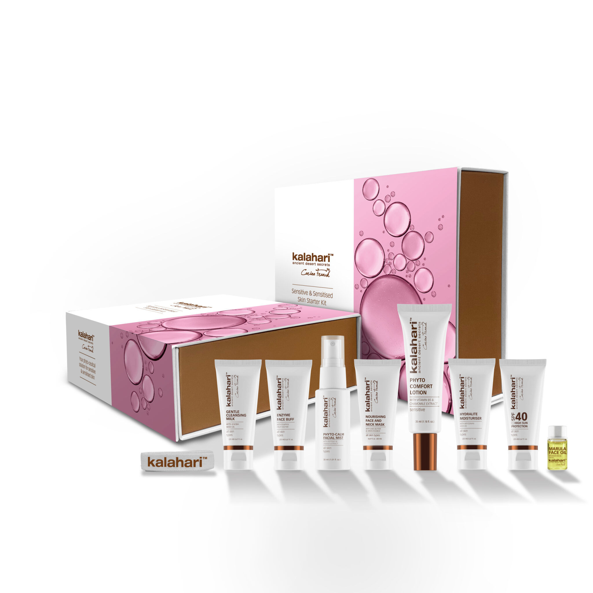 *20ml Gentle Cleansing Milk*20ml Enzyme Face Buff*50ml Phyto-calm Facial Mist*20ml Nourishing Face & Neck Mask*35ml Phyto Comfort lotion*20ml Hydralite Moisturiser*20ml SPF40*3ml Marula Oil*1x Eco Elastic Head Band